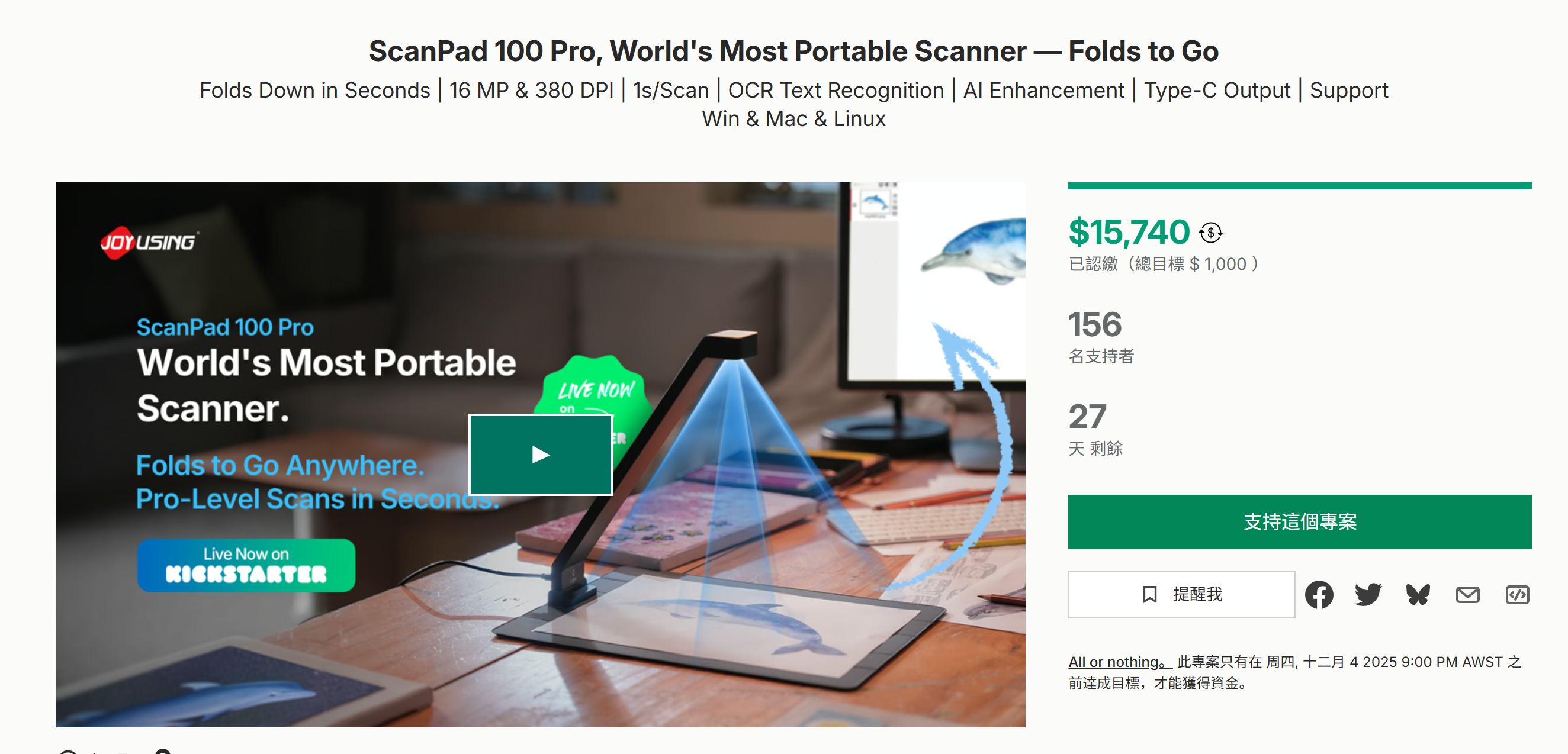 几秒钟内即可折叠| 1600万像素和380 DPI | 1秒/扫描| OCR文本识别| AI增强| Type-C输出|支持Win、Mac和Linux