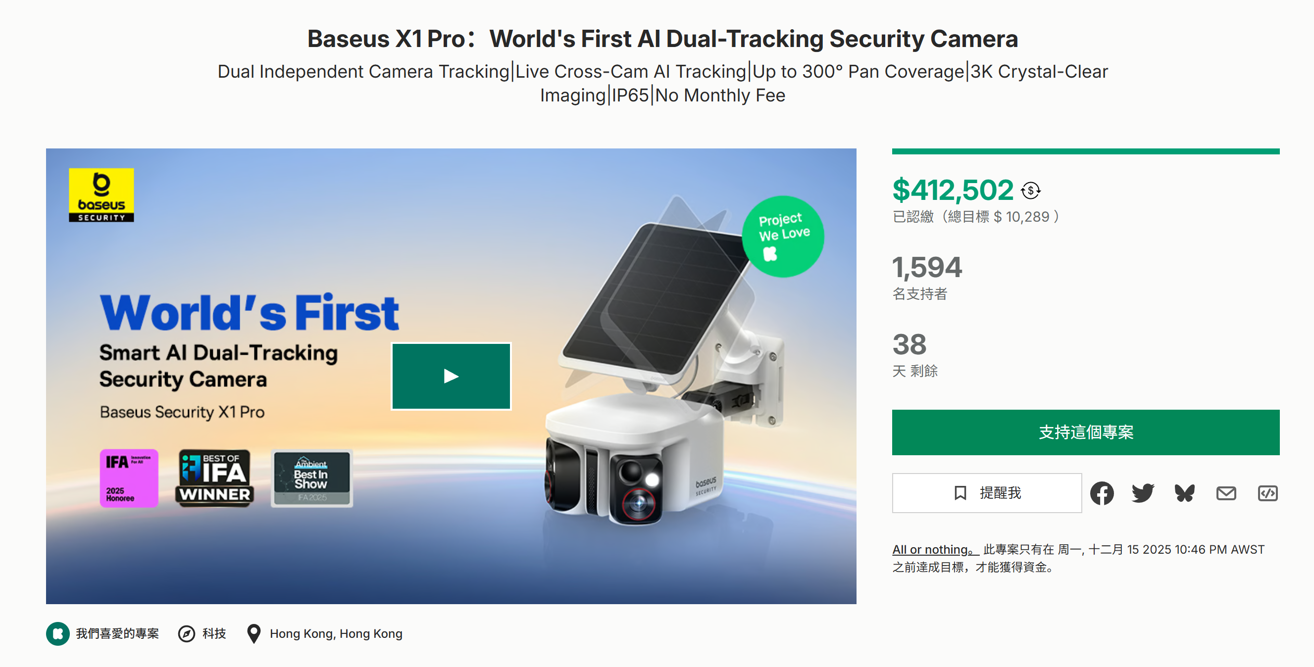 双独立摄像头跟踪|实时交叉摄像头AI跟踪|高达300°全景覆盖| 3K清晰成像| IP65 |无月费