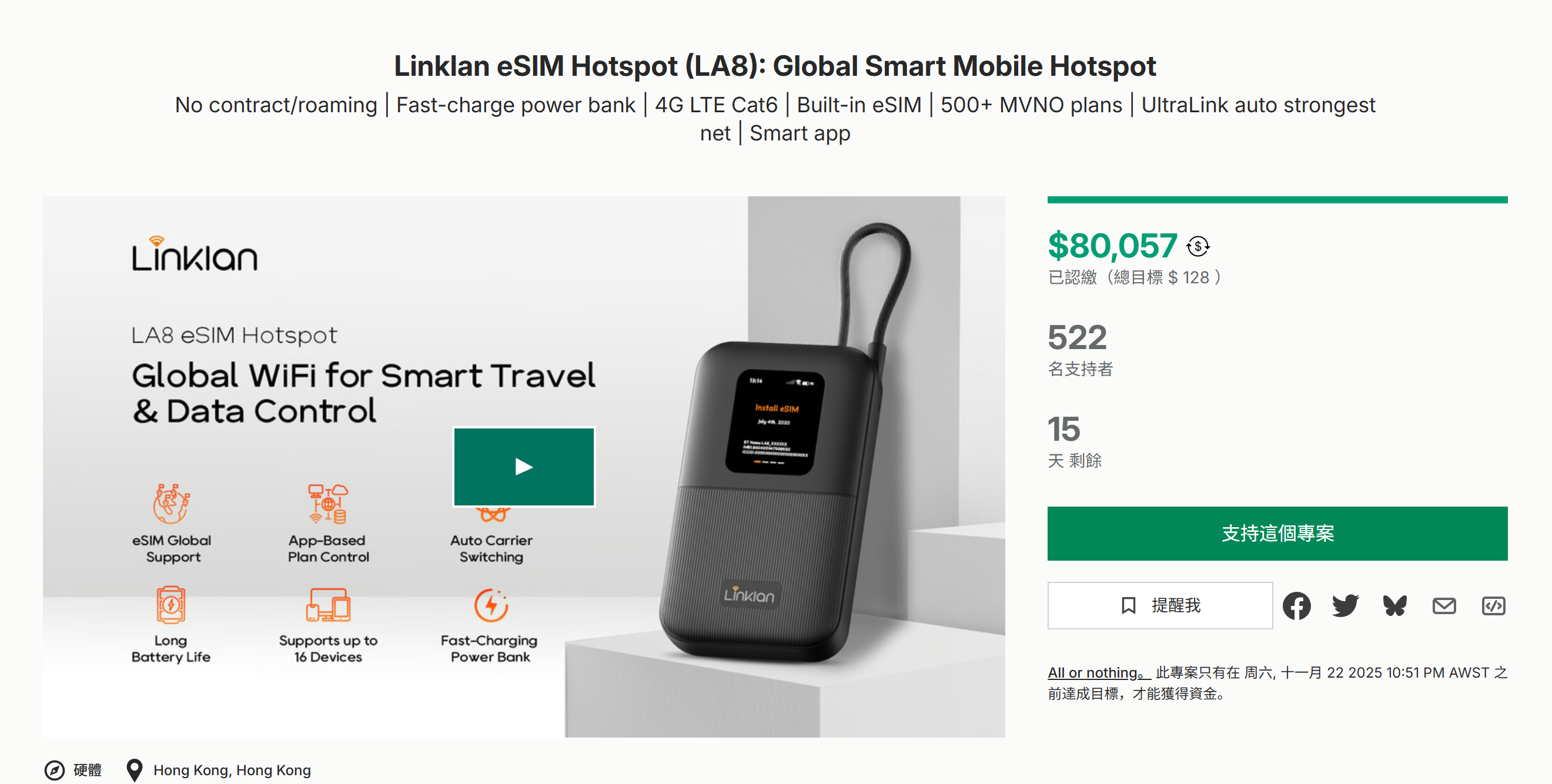 无合约/漫游|快速充电移动电源|4G LTE Cat6|内置eSIM |500+MVNO计划|UltraLink自动最强网络|智能应用