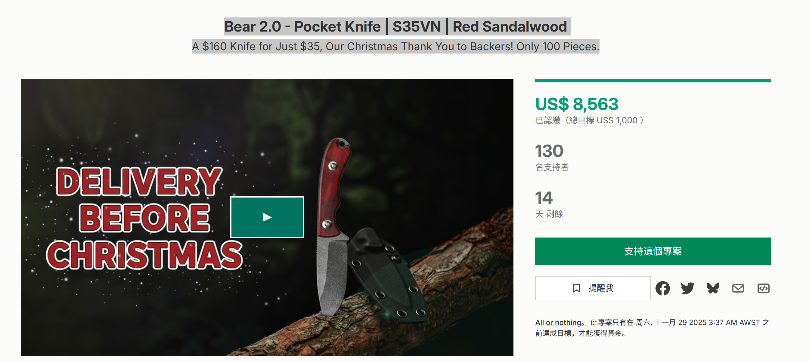 A $160 Knife for Just $35, Our Christmas Thank You to Backers! Only 100 Pieces. 一把160美元的刀只需35美元,我们的圣诞节感谢支持者!只有100件。 海外众筹运营就找邓立斌 灵活的合作模式:采销、代运营、顾问陪跑 对优质的项目我们提供投资 电话:15362888518