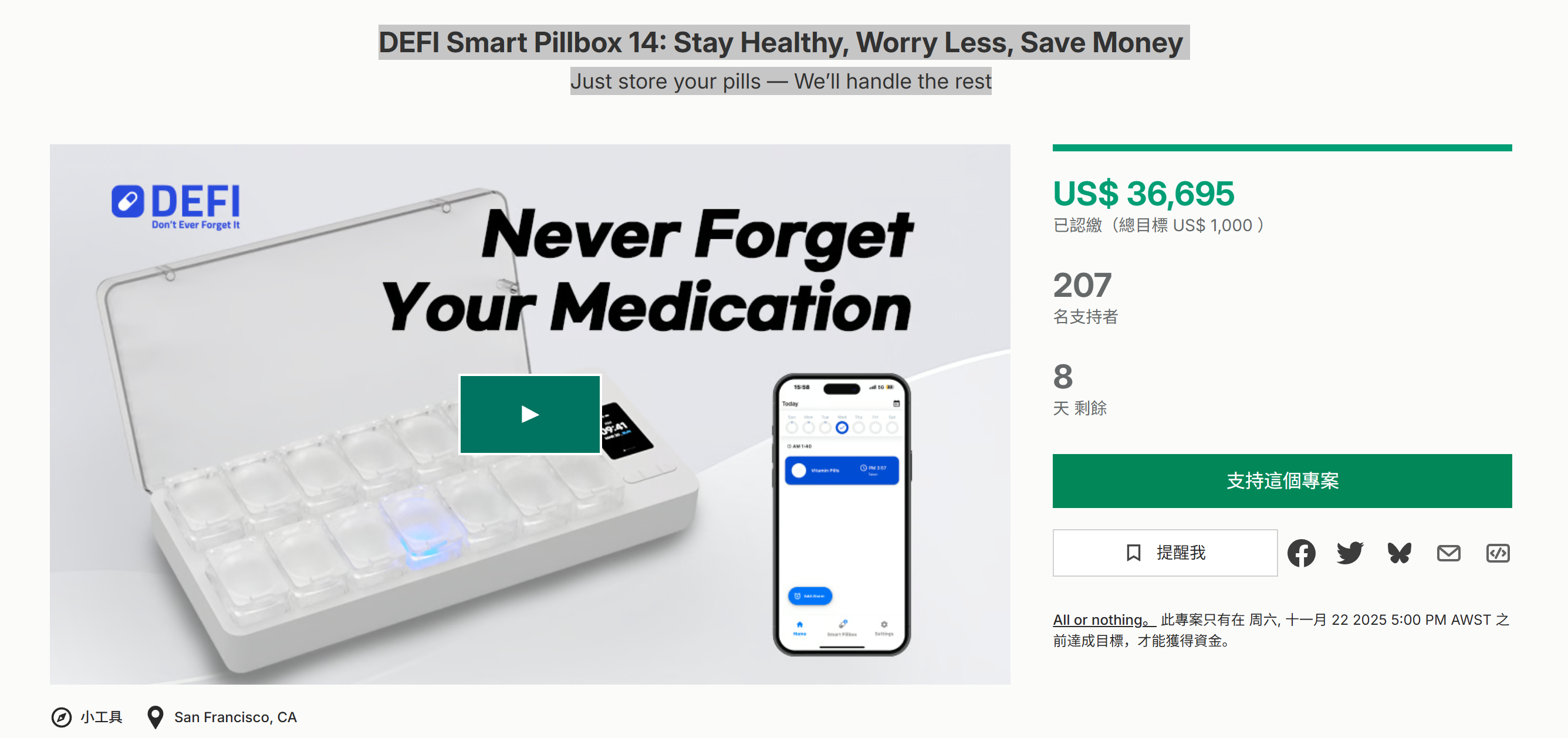 首页•项目分享•海外众筹-DEFI智能药盒14:保持健康,少担心,省钱