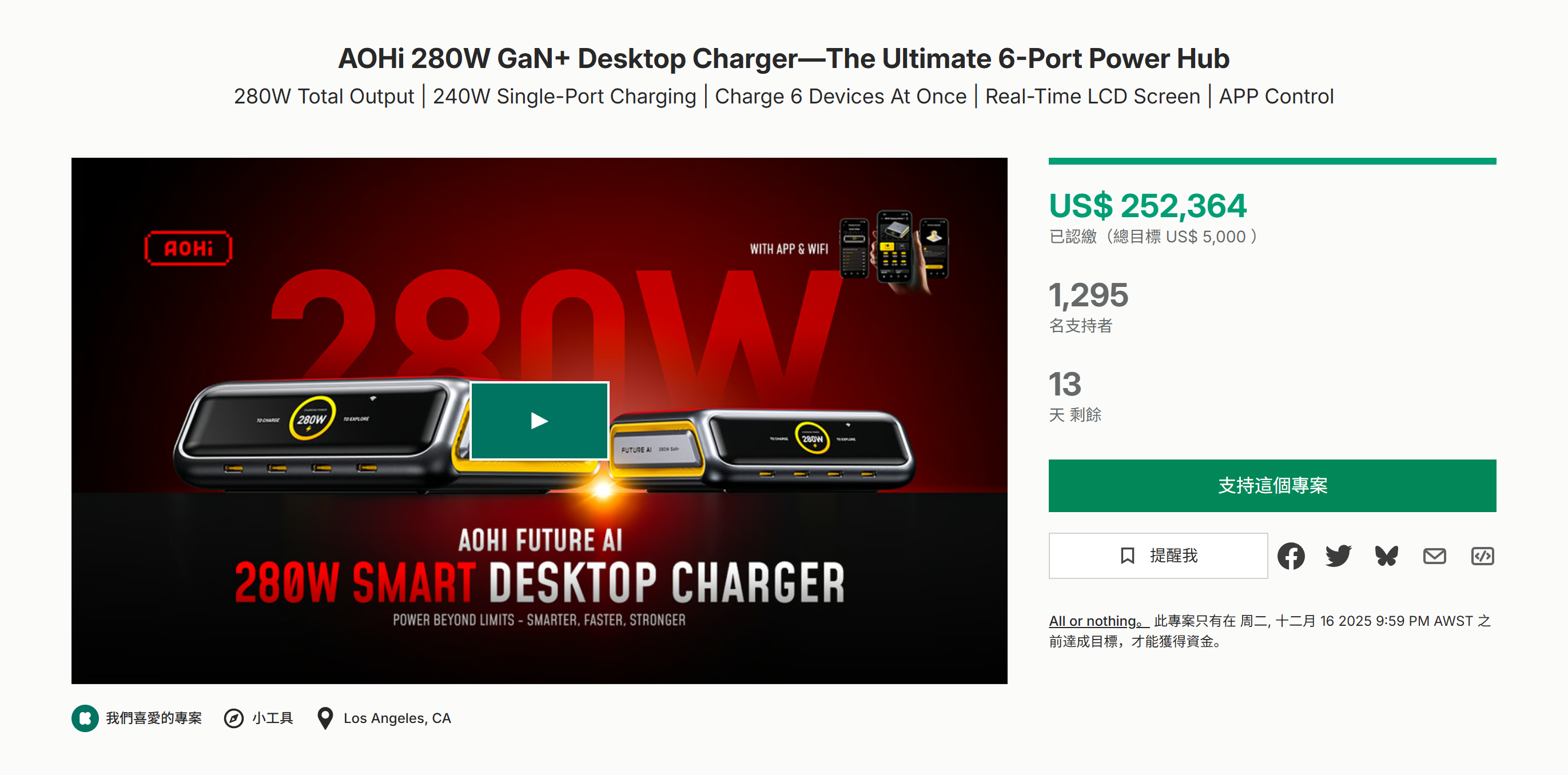 海外众筹-AOHi 280W GaN+台式充电器——终极6端口电源集线器